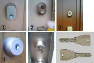 上記①~③までの写真が右端のディンプルキーを使った鍵です。これらサッシシ錠向けの現在新築の戸建ての玄関錠として普及しているディンプルキーです。合鍵は全てメーカー注文です。